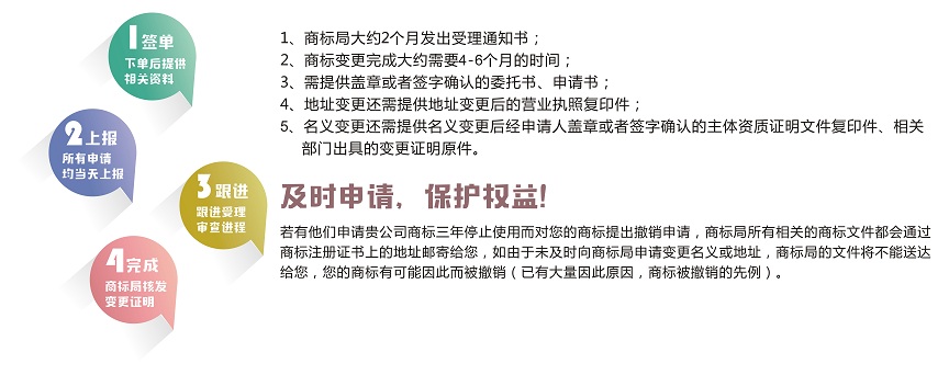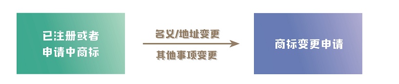 商標核準注冊后,商標注冊人的名義、地址或其他注冊事項發(fā)生變更的,應當向商標局申請辦理相應變更手續(xù)。變更商標注冊人名義或地址的,商標注冊人應將其全部注冊商標一并變更。商標變更可以是已經(jīng)獲準注冊的商標,也可以是在申請中的商標。