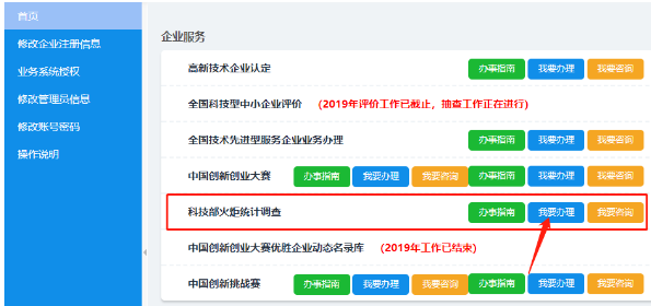 進(jìn)入『科技部火炬統(tǒng)計(jì)調(diào)查』-『我要辦理』;