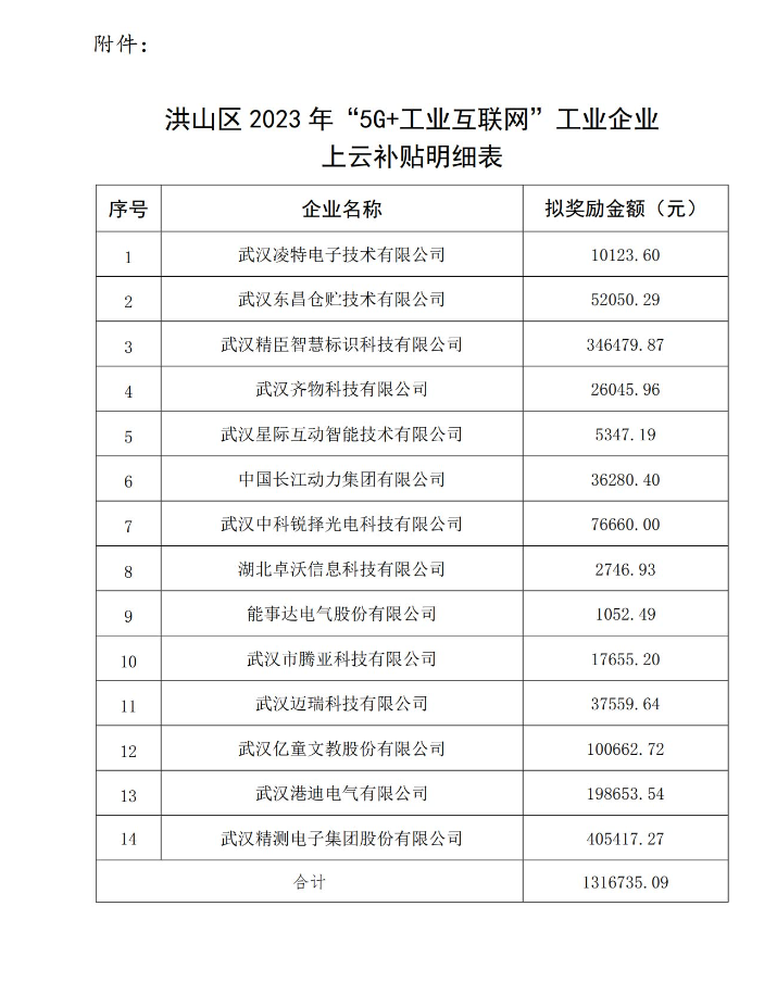 附件:洪山區(qū)2023年“5G+工業(yè)互聯(lián)網(wǎng)”工業(yè)企業(yè)上云補貼明細表